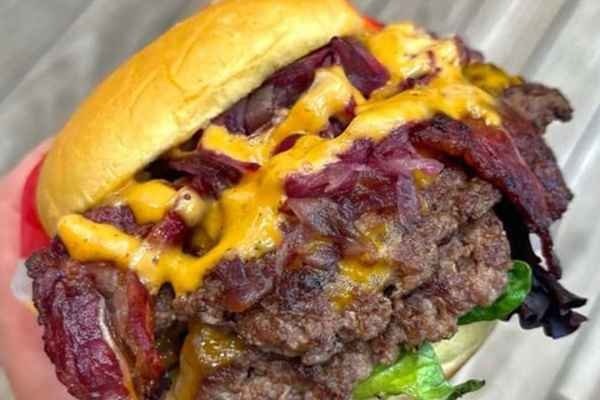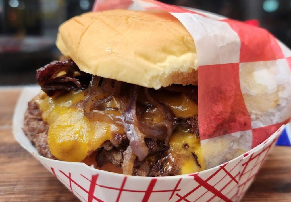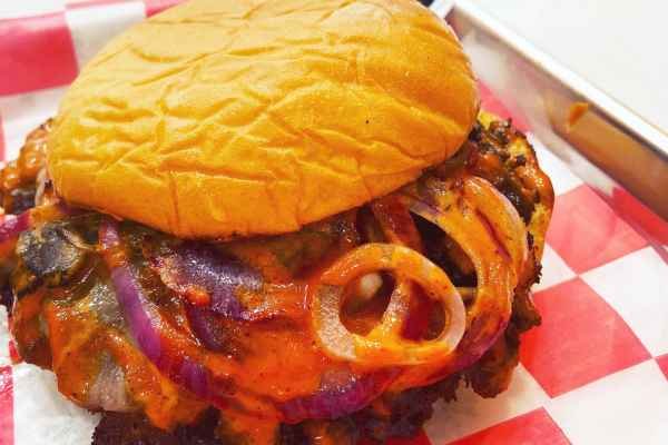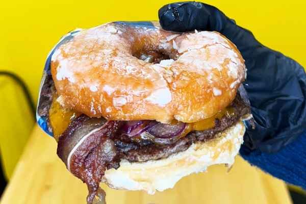 Sweet maple glazed doughnut, double juicy patty, double cheddar cheese, crispy bacon, sauteed onions, topped with red hot sauce.